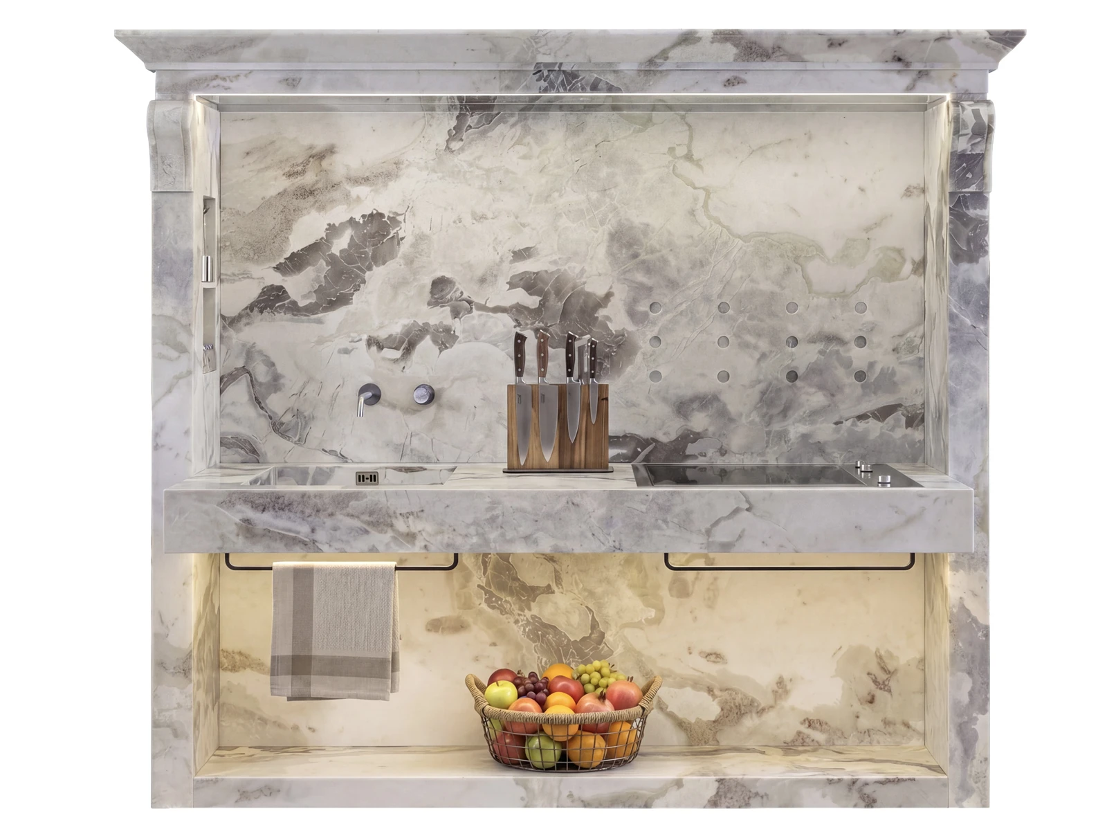 The undisputed protagonist is marble, a timeless material sculpted by the expert hands of Senamarmi’s artisans, who infuse every block with enduring solidity and singular aesthetic depth. Characterized by generous surfaces and inviting forms, Flaminia harmonizes the raw elegance of natural stone with sophisticated, integrated technology.